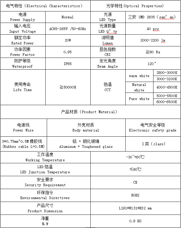 PF73L-20W产品特点(Product features): 1.配合恒流率电源,显色效果和亮度更出色; 2.了铝基板面积,可以快速将热量传给壳体,增加了灯具的导热效果 3.盖咬合设计有效防止侧边漏光; 4.等级IP65 PF73L-20W产品规格(Product Spec):