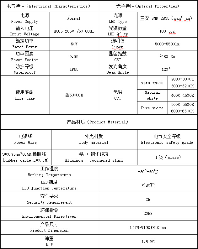 PF73L-50W产品特点(Product features): 1.配合恒流率电源,显色效果和亮度更出色; 2.了铝基板面积,可以快速将热量传给壳体,增加了灯具的导热效果 3.盖咬合设计有效防止侧边漏光; 4.等级IP65 PF73L-50W产品规格(Product Spec):