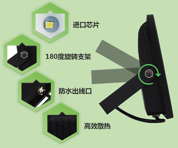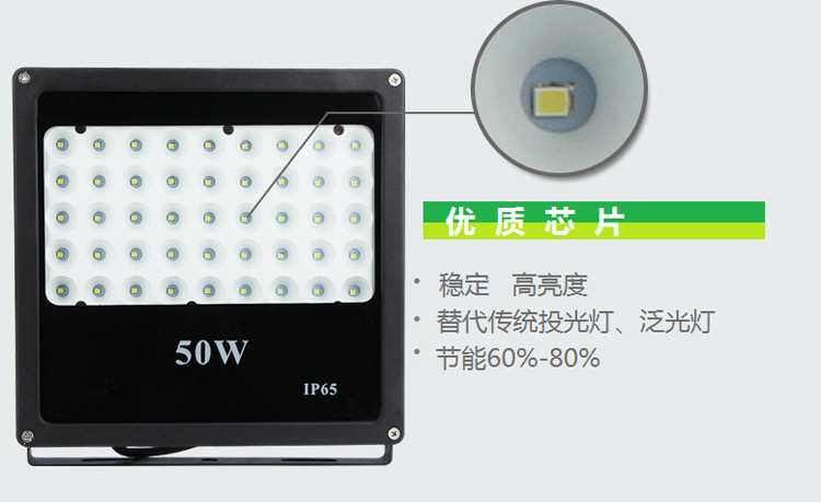 产品特点: 1外壳采用高压铸铝,散热性能好 2薄灯体,体积小、重量轻,精致美观 3灯体采用钢化玻璃和防水硅胶密封,防护等级IP65 4光源均采用高流明LED芯片,内置恒流电源 5反光杯多种角度可选,既可用于泛光大面积照明也可用于投光远距离照明。 适用范围: 建筑物、体育场、广场、码头、绿化照明、广告、大厦外景、车站、铁路、隧道、港口等户外照明
